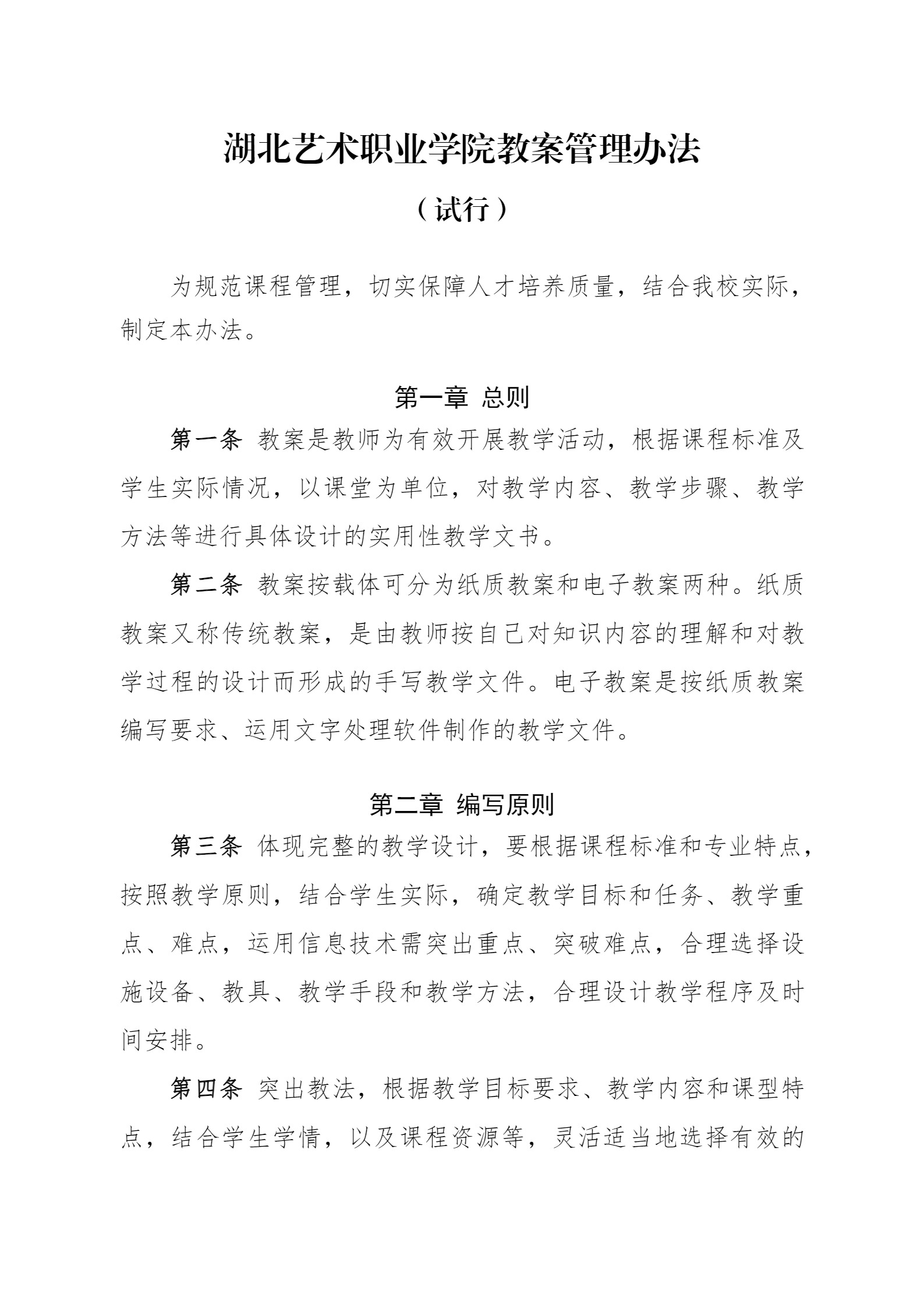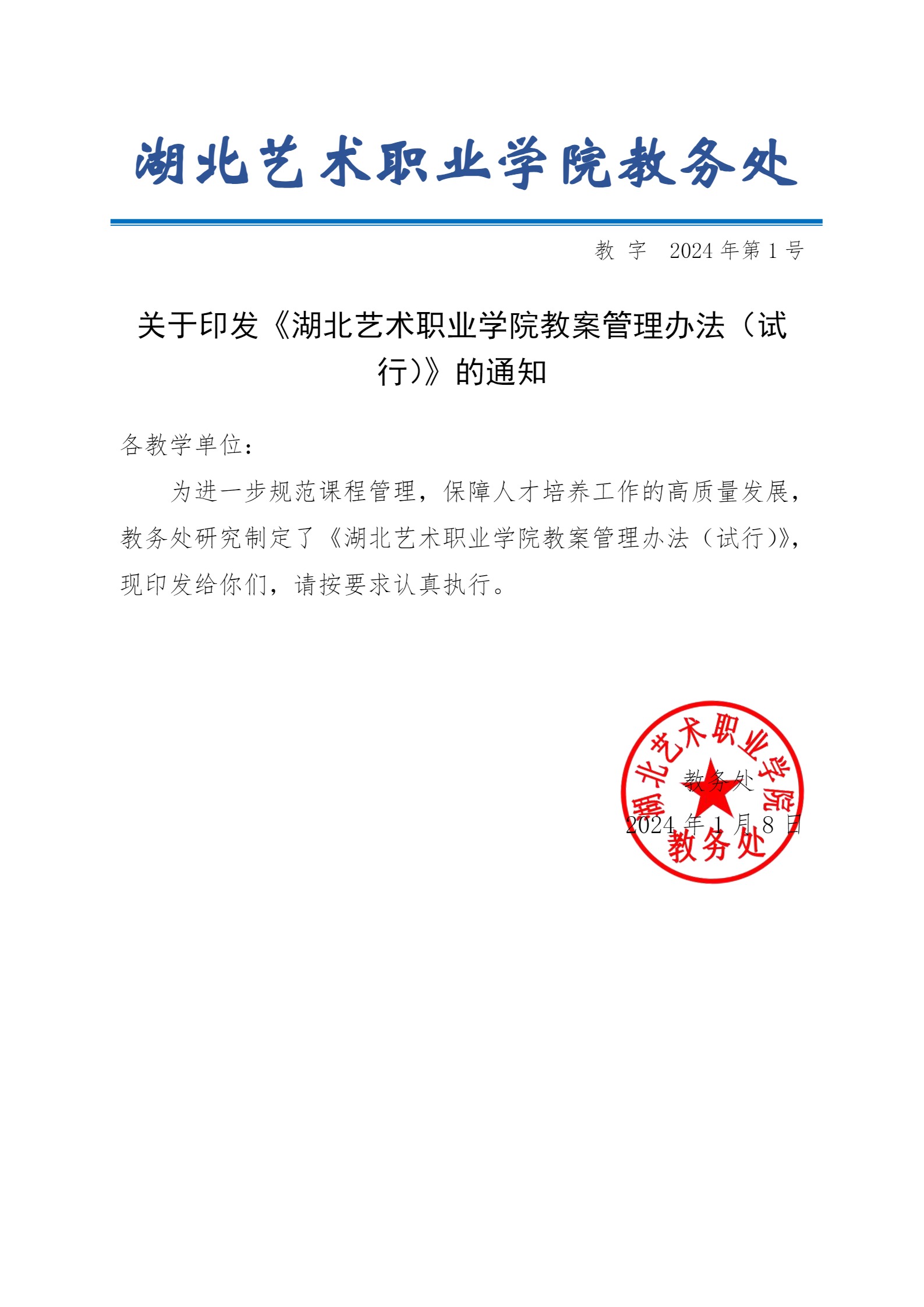 鄂艺术职院 教字【2024】1号 关于印发《湖北艺术职业学院教案管理办法(试行)》的通知
