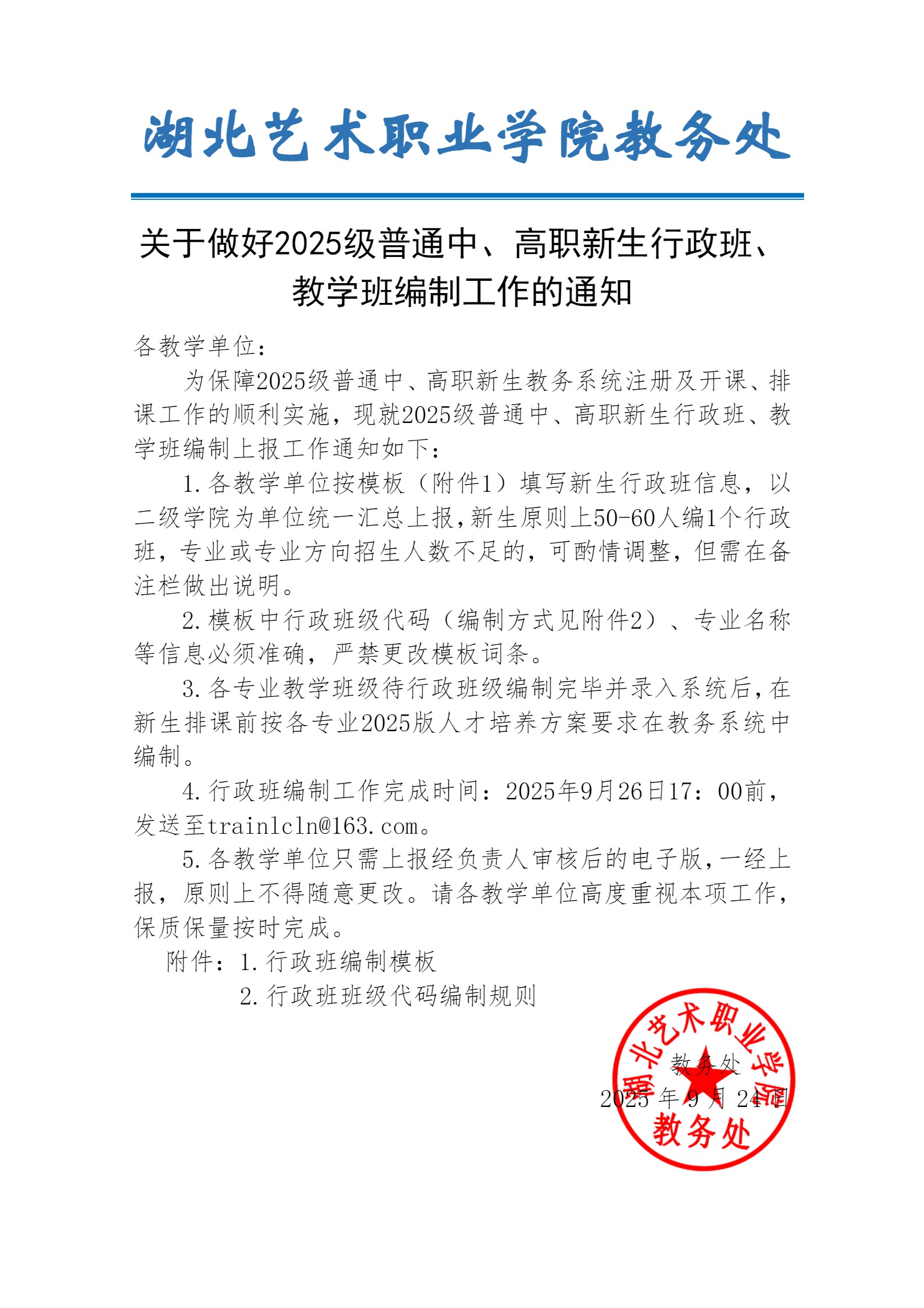 关于做好2025级普通中、高职新生行政班、教学班编制工作的通知