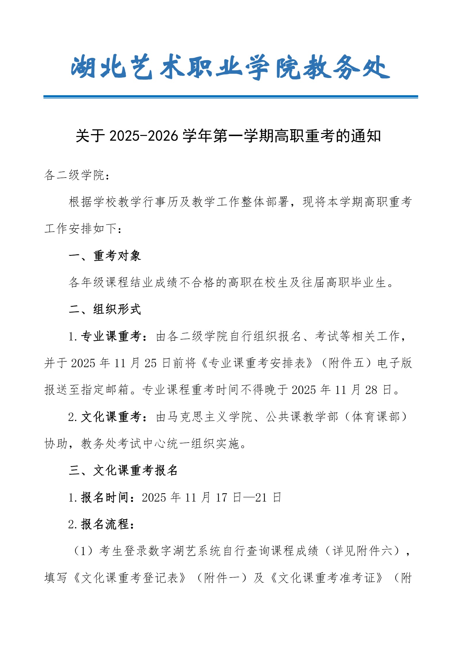 关于学院2025-2026学年第一学期高职重考安排的通知